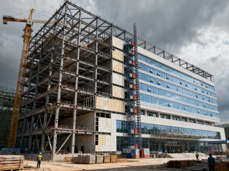 3.ઓન-સાઇટ ઇન્સ્ટોલેશન: જ્યારે ફેક્ટરીમાં ઘટકો પ્રિ-ફેબ્રિકેટેડ હોય છે, ત્યારે બાંધકામ ટીમ ફાઉન્ડેશન પૂર્વ-દફન પૂર્ણ કરવા માટે બાંધકામ સાઇટ પર એન્કર બોલ્ટને પ્રી-બરી કરશે. છેલ્લે, હાઇ-રાઇઝ પ્રિફેબ્રિકેટેડ મેટલ હોસ્પિટલ બિલ્ડિંગની એસેમ્બલી હાથ ધરવામાં આવે છે.